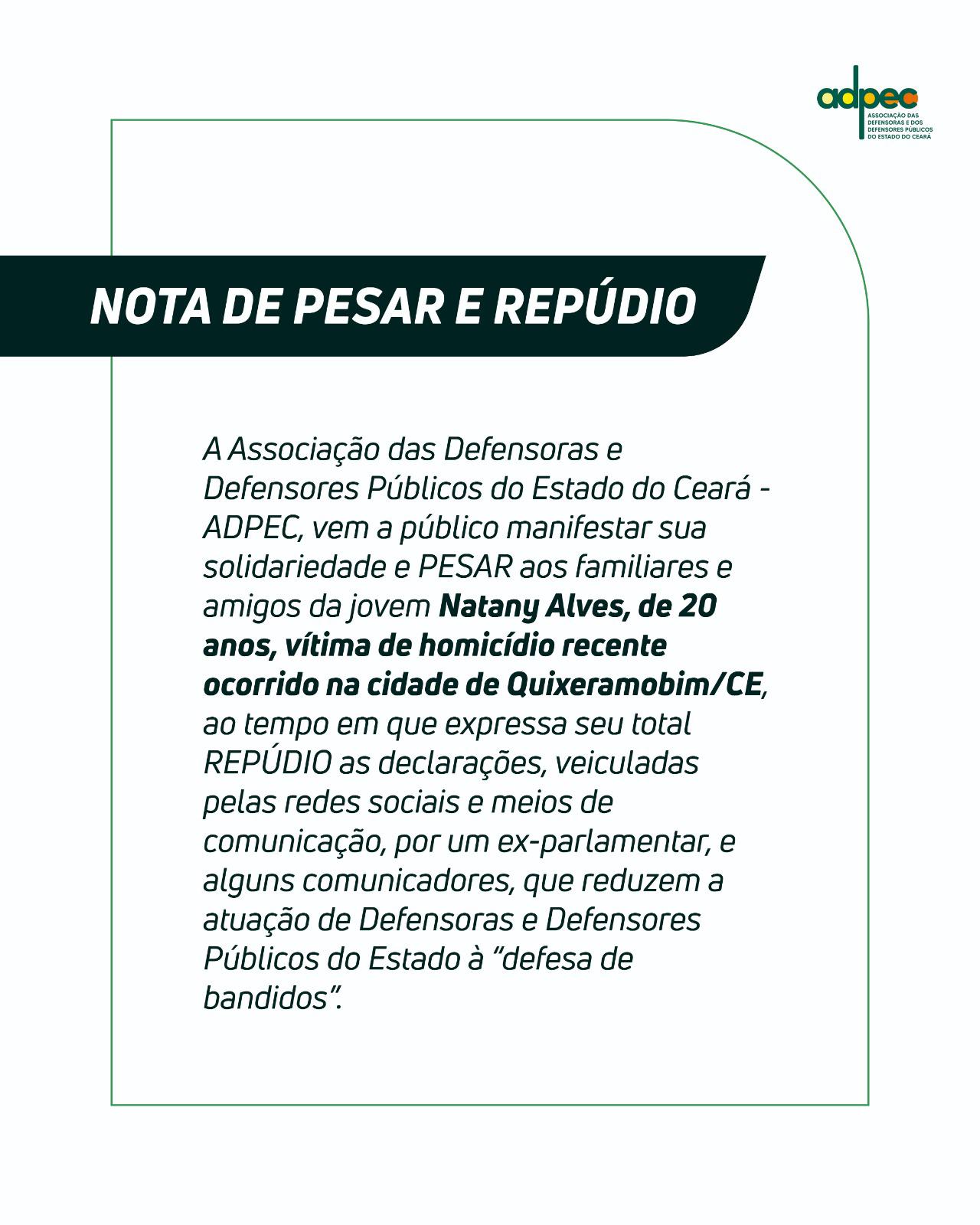 A Associação das Defensoras e Defensores Públicos do Estado do Ceará – ADPEC, vem a público manifestar sua solidariedade e PESAR aos familiares e amigos da jovem Natany Alves, de 20 anos, vítima de homicídio recente ocorrido na cidade de Quixeramobim/CE, ao tempo em que expressa seu total REPÚDIO as declarações, veiculadas pelas redes sociais e meios de comunicação, por um ex-parlamentar, e alguns comunicadores, que reduzem a atuação de Defensoras e Defensores Públicos do Estado à “defesa de bandidos”.